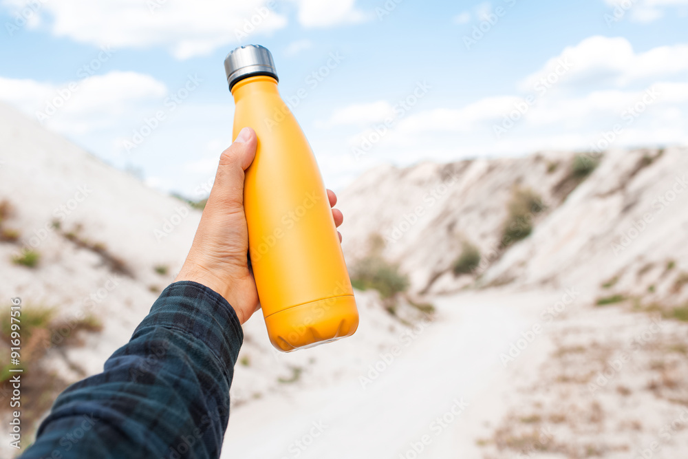 Male hand holding steel thermo water bottle of yellow color on background of sand hills.