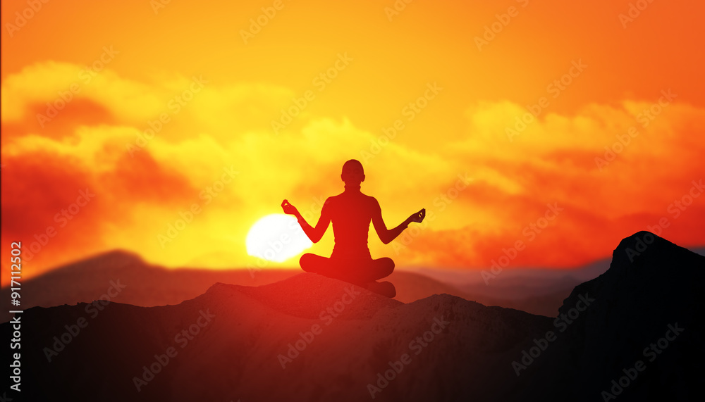 Woman meditating at sunset on a mountain top, silhouetted against an orange sky.