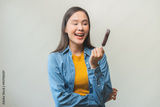 Cheerful, happy positive asian woman wearing casual with brunette hair, enjoy eating delicious popsicle, cute girl holding cold dessert, lolly frozen stick with chocolate tasty ice cream on background