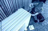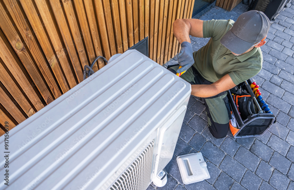 Technician Repairing Air Conditioning Unit Outside Modern Building on Sunny Day