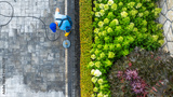 Worker Maintaining a Landscaped Garden With Fresh Flowers in a Residential Area
