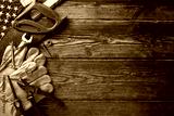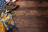 Labor Day in USA concept featuring an assortment of tools, gloves, and American flag on a wooden background