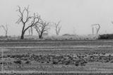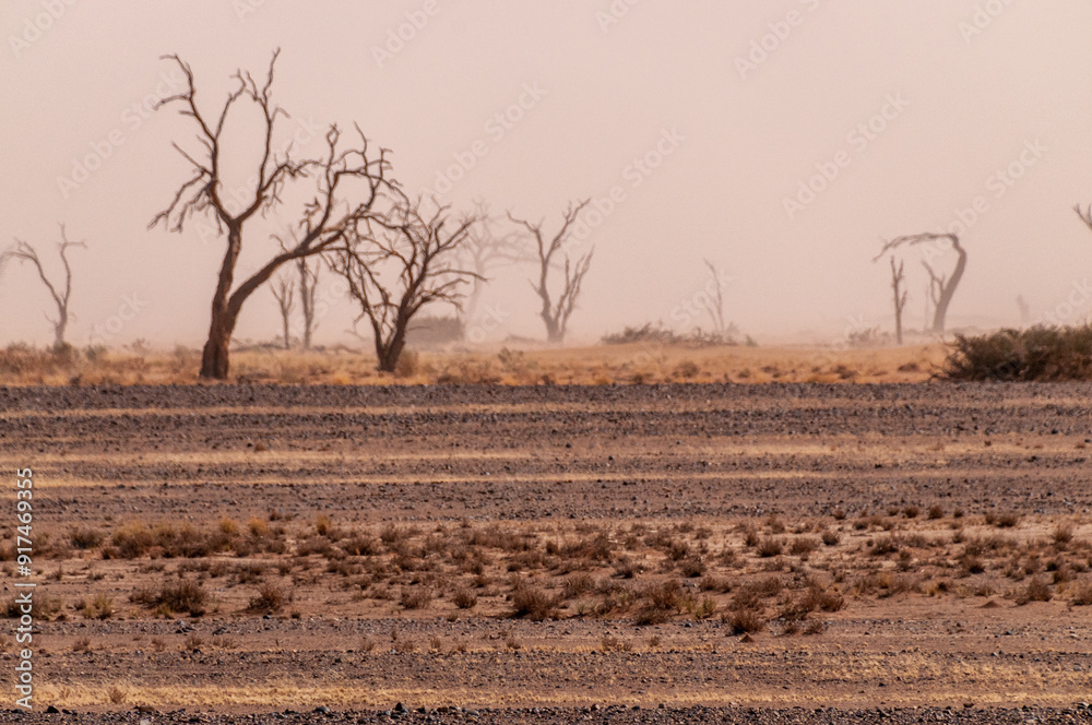 A tree-lined landscape in the Namibia sossusvlei in limited visibility, due to a sandstorm.