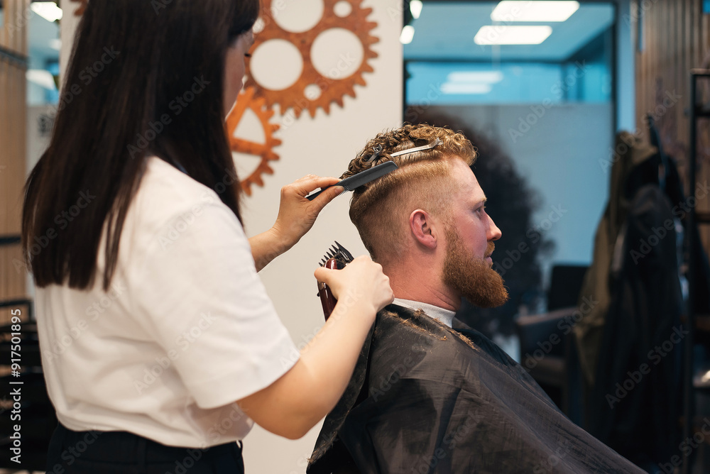 Red-haired bearded man sitting in barbershop and female barber making hairdo to guest
