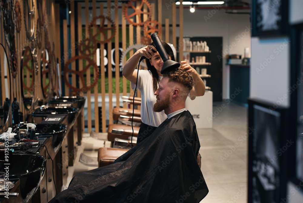 Professional woman-hairdresser is drying the hair of a curly red-haired man with hairdryer.