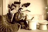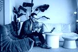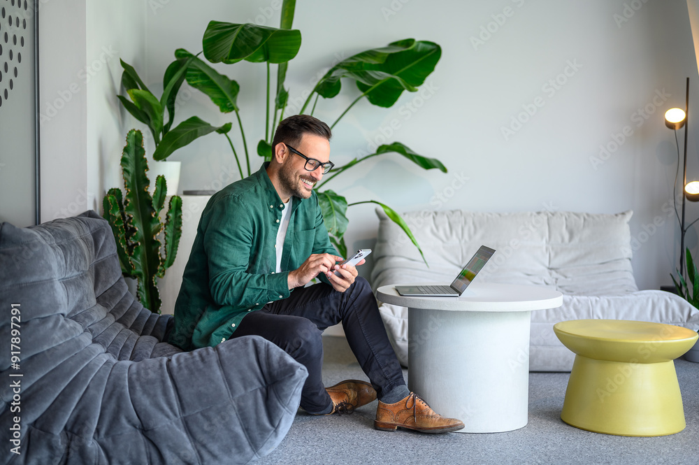 Happy manager with laptop on table using smart phone apps while sitting on sofa in modern workplace