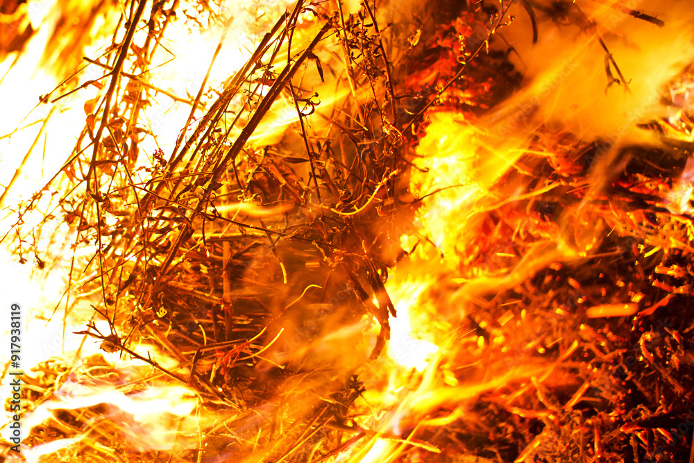 Flames texture. Glowing embers from burning straw. Heat pattern. Blazing fire background. Vibrant orange and red flames. Energy of a raging fire. Burning wood flames closeup.