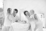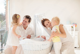 Family with kids playing with newborn baby
