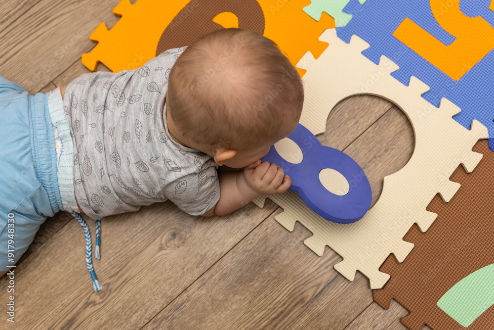 An infant on a wooden floor plays with a number puzzle mat. The baby in a gray shirt and blue shorts reaches for the number "8" piece.