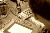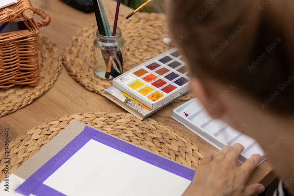 Kobieta malująca akwarelami kwiaty w tonacjach różu i fioletu. Praca położona jest na podkładce z fioletowym brzegiem. W tle część palety z pigmentami i brązowy, pleciony element.