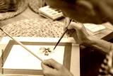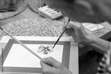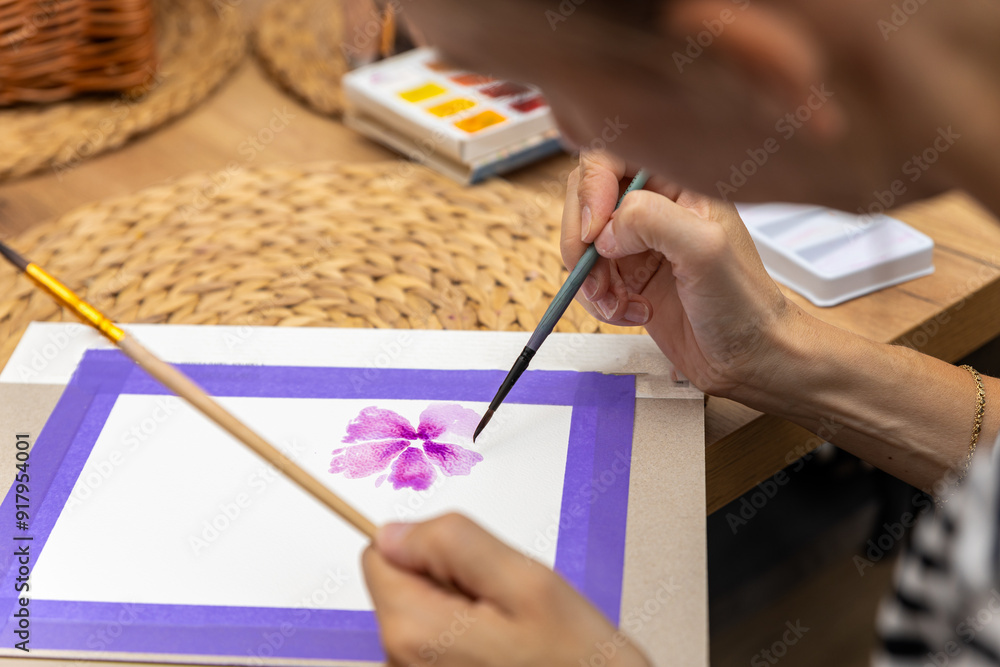 Osoba tworząca obraz akwarelowy z motywem kwiatów w odcieniach różu i fioletu. Dzieło znajduje się na podkładce z fioletową krawędzią. W tle fragment palety z farbami i brązowy, pleciony detal.
