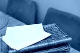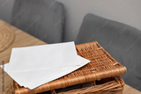 białe arkusze papieru lub bloku do akwareli, leżące na brązowym, plecionym koszu lub podkładce. W tle widoczne są rozmyte fragmenty mebli tapicerowanych w szarym kolorze oraz jasny blat stołu.