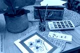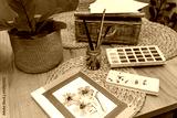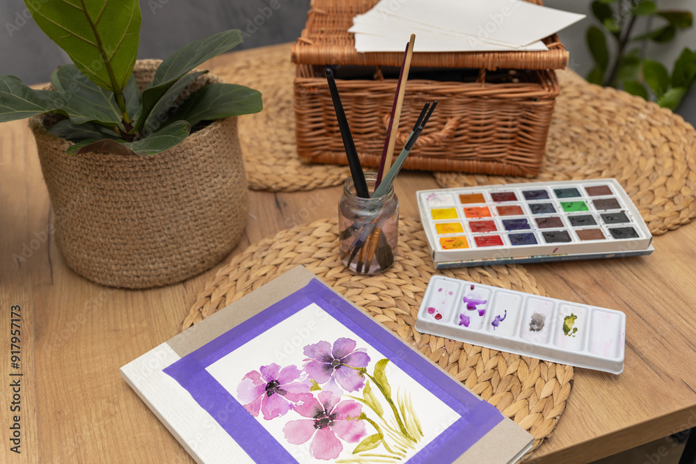 Zestaw do malowania akwarelami na drewnianym stole z rustykalnym podkładem. Paleta z pędzlami, farbami w kostkach i szklanka wody tworzą kompozycję idealną do kreatywnej pracy.