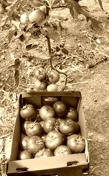 Freshly picked organically grown tomatoes in a box, selective focus.