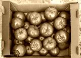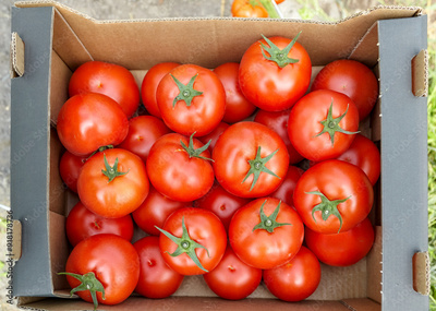 Freshly picked organically grown tomatoes in a box, selective focus.