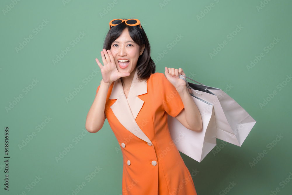 An excited woman in an orange dress holding a shopping bag and shouting with excitement against a green background. Perfect for shopping, lifestyle, and happiness themes.