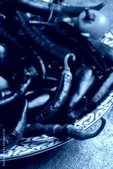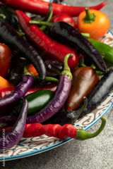 Mix of hot cayenne, jalapeno and buena mulata peppers on a plate. Close-up.