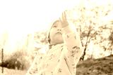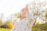 Cheerful toddler girl in white floral jumpsuit sitting in pine forest park. Family lifestyle, childhood development, or outdoor recreation themes.