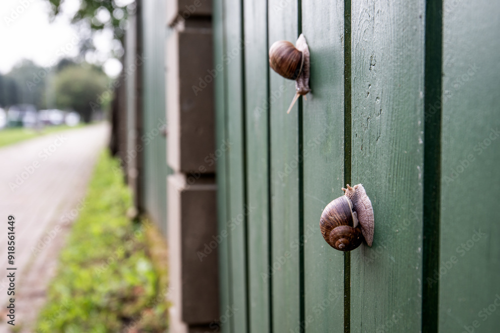 Snails vertical crawling on wooden fence, concept of overcoming impossible obstacles and difficulties