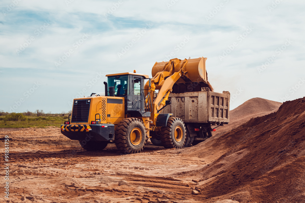 Excavator Loads Gravel into a Truck on a Crushed Stone Quarry