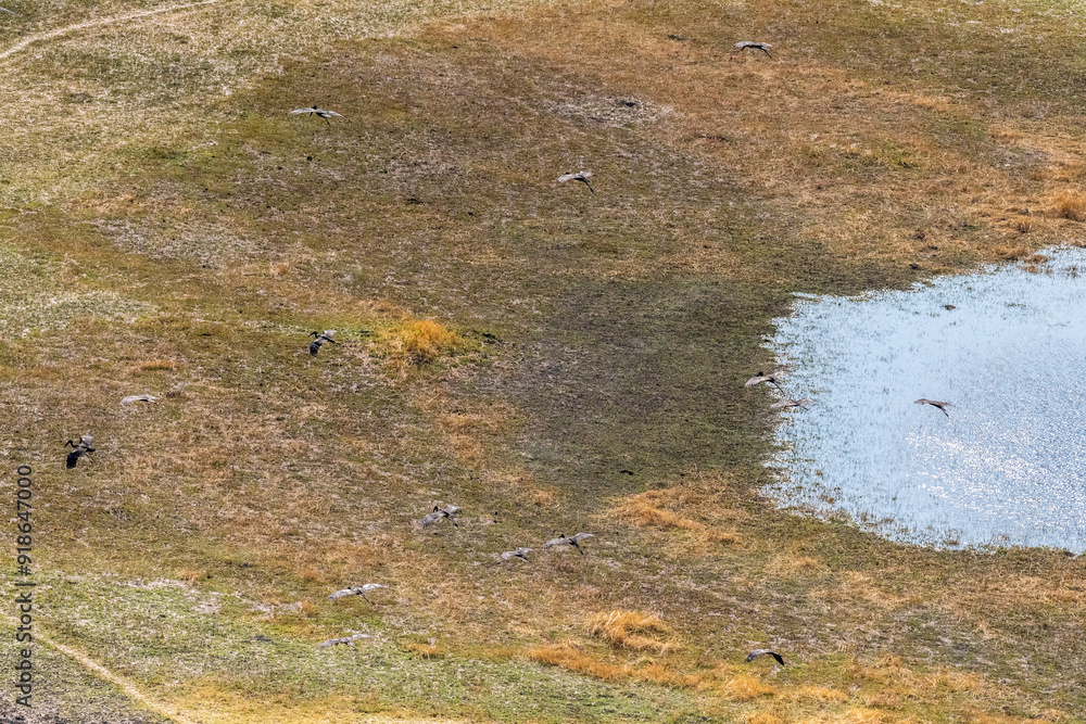 Aerial shot of an African Openbill - Anastomus lamelligerus- flying over the Okavango Delta, Botswana.