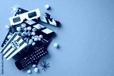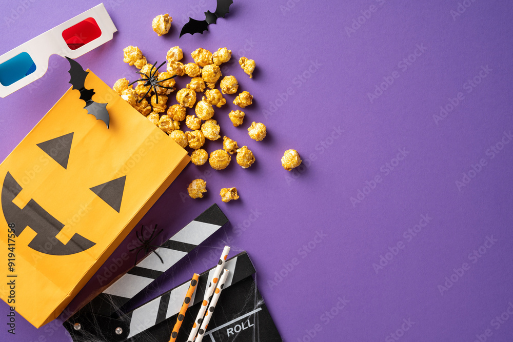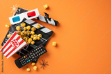 Halloween movie night concept with popcorn, 3D glasses, remote control, and spooky decorations on orange background