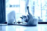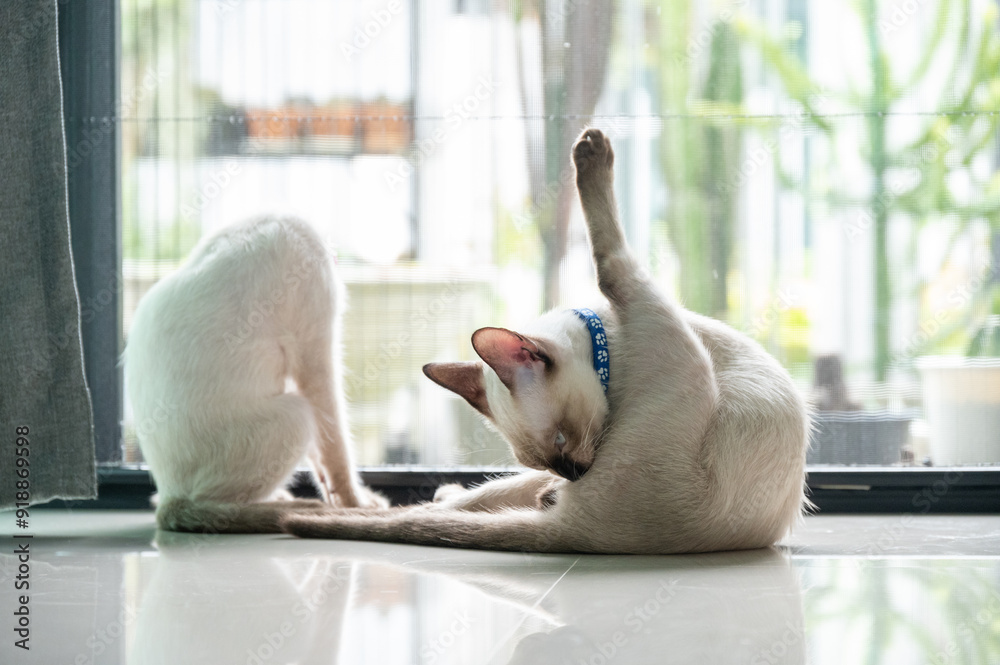 Kitten Siamese cat grooming itself with funny action. Cats are built to groom themselves from their tongue to their coat.