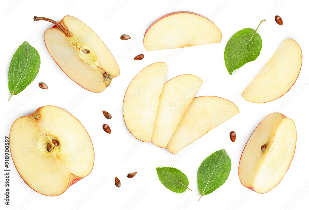 sliced apple and leaves of an apple tree on a white isolated background
