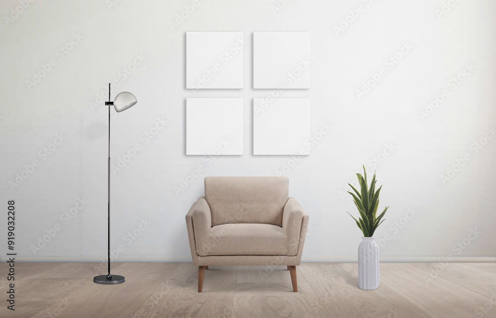 White square art canvas four-piece set on living room wall with chair, plant, and lamp. Ideal for mockup, art design presentation, and enhancing home interior decor