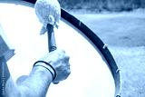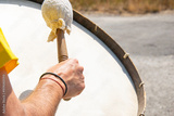 Musician playing a bass drum during an outdoor traditional festival in Galicia. Galician culture, folk music concept