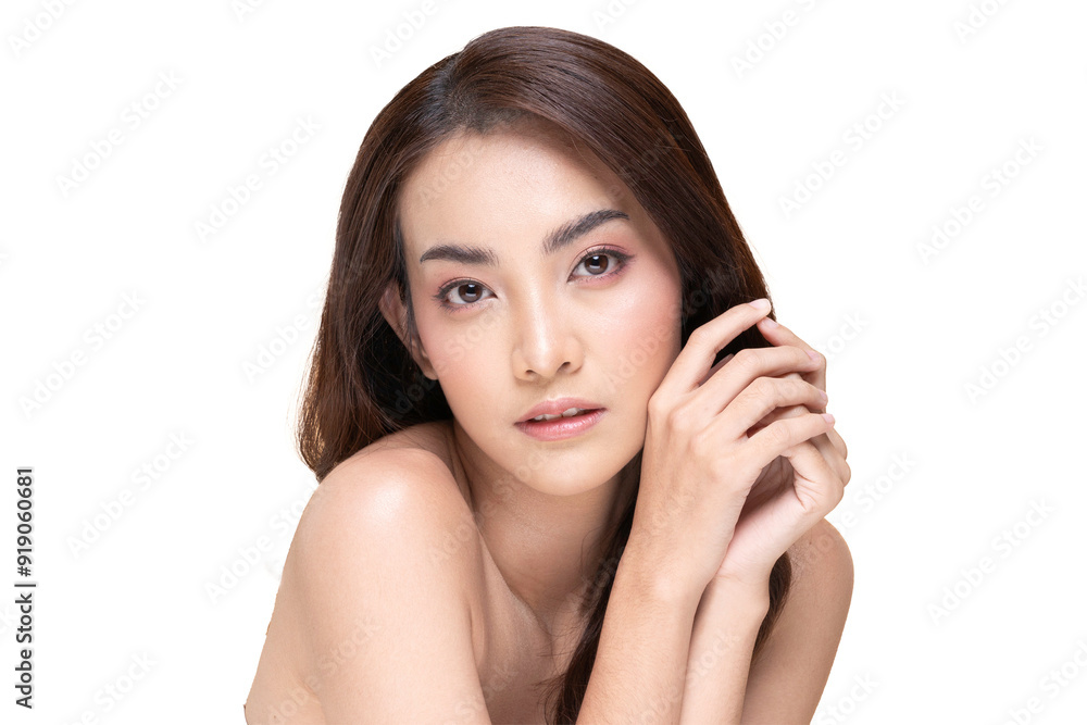 Asian beautiful young woman with flawless skin and natural makeup smiles gently