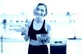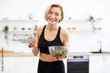 Smiling woman in sportswear holding fresh salad bowl in bright modern kitchen. Promoting healthy eating, fitness, and balanced diet. Ideal image for healthy lifestyle and wellness concepts.