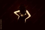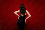 Rear view photo of sexual attractive lady celebrity wearing black dress isolated on red color background
