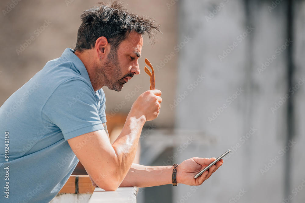 attractive young man with sunglasses looking at his mobile phone on the street outdoors