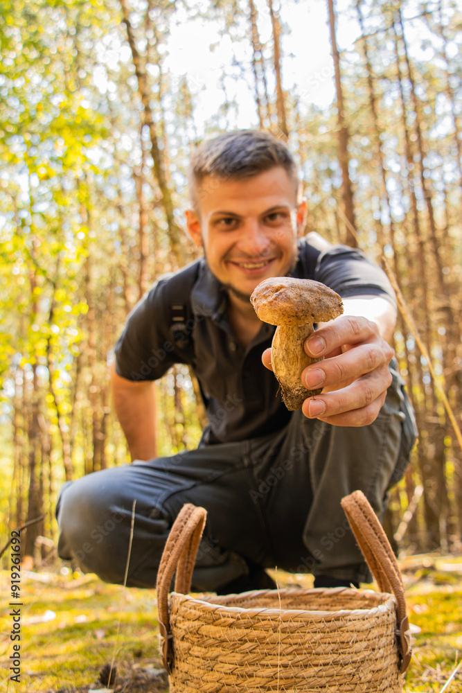 Smiling man holding mushrooms. Mushroom picking. Mushrooms in the forest. Happy man. Close-up of mushroom