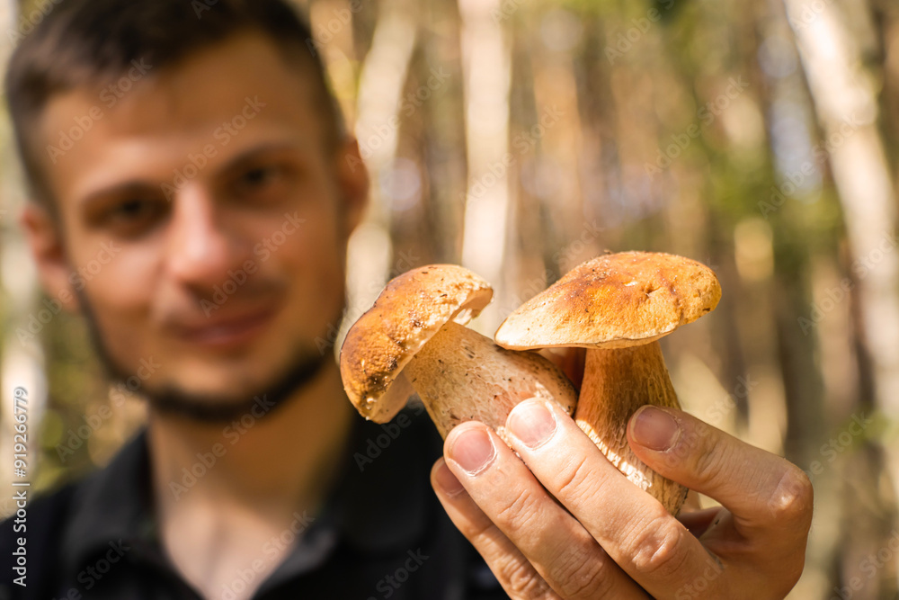 Smiling man holding two mushrooms. Mushroom picking. Mushrooms in the forest. Happy man. Close-up of mushroom