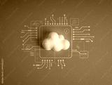 Cloud computing infrastructure technology, data system storage service concept. Modern white small cloud with digital tools management icons and circuit graphic on blue background, minimal style.