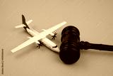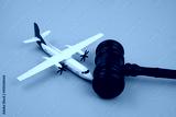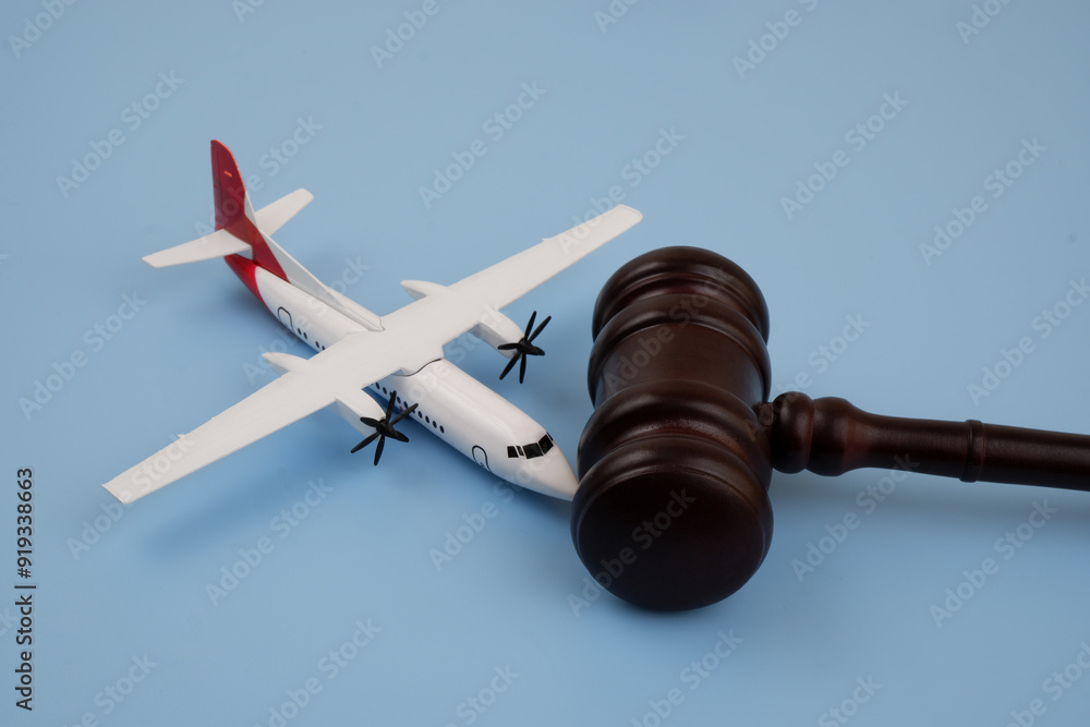 Aviation law concept. Wooden judge gavel and airplane model on blue background.