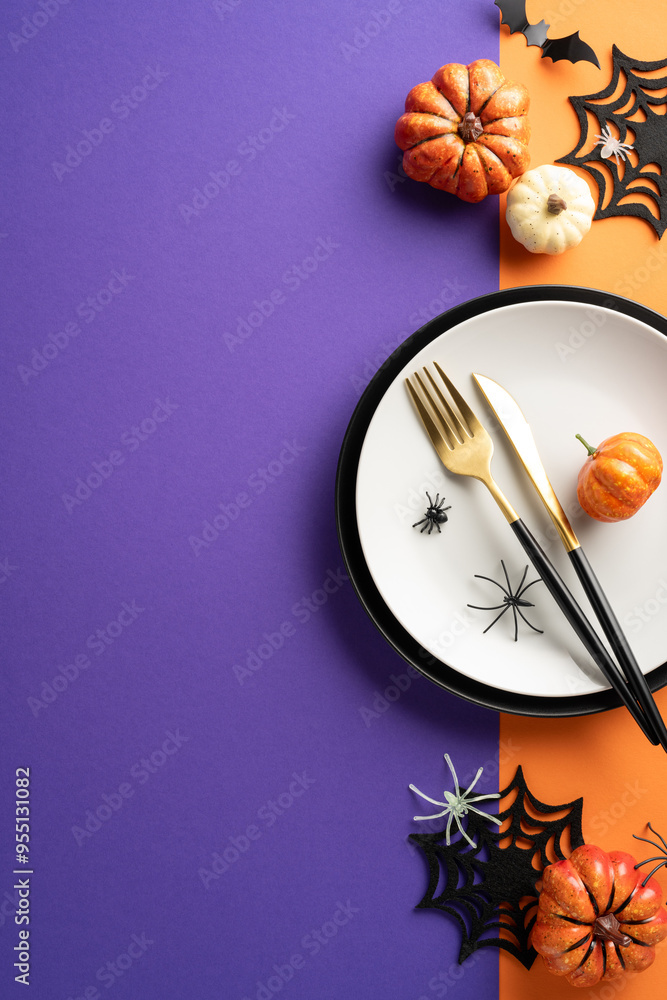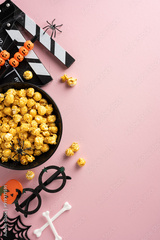 Halloween-themed vertical movie night setup with popcorn, spooky decor, clapperboard, and pumpkin ornaments on a pink background