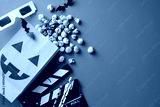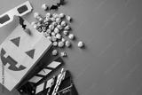 Halloween themed flat lay with popcorn, decorations, and movie clapper on a purple background