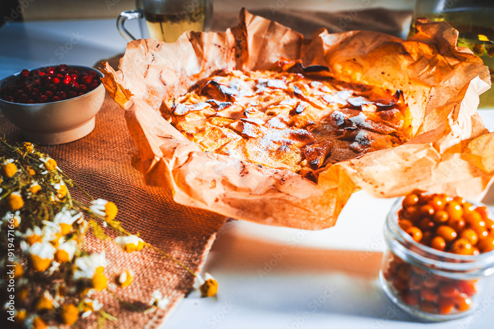 Handmade apple pie according to a traditional French recipe on the table with a napkin made of canvas fabric, with pharmacy chamomile.