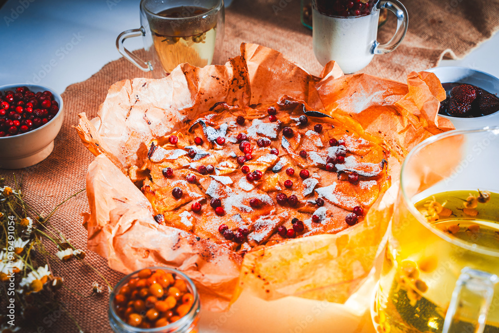 Handmade apple pie according to a traditional French recipe on the table with a napkin made of canvas fabric, with pharmacy chamomile.
