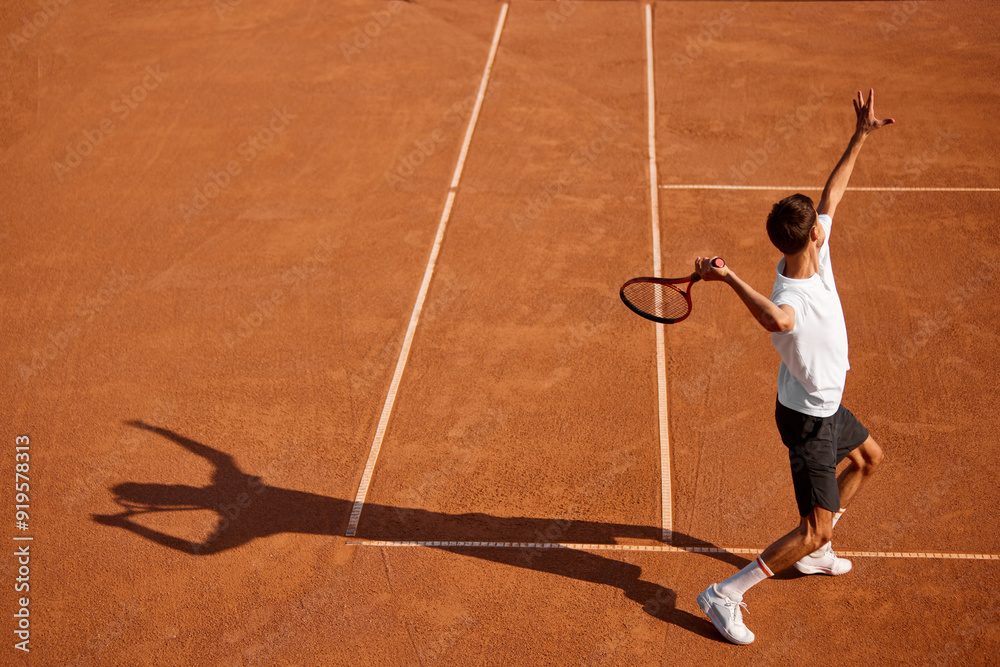 Back view image of focused young man in white t-shirt and black shorts, tennis player training on clay court. serving ball with racket. Concept of sport, competition, active and healthy lifestyle