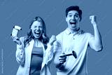 Couple Playing Video Exciting Game On Tv With Joystick gamepad controller,Studio