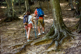 View from the back of two people hiking up the hill in the forest with hiking equipment.