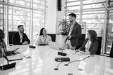 Man CEO talking on a meeting with his colleagues about business plan, future collaboration.