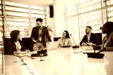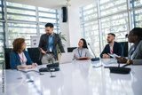 Man CEO talking on a meeting with his colleagues about business plan, future collaboration.