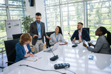 Man CEO talking on microphone on a meeting with his colleagues about business plan, future collaboration.