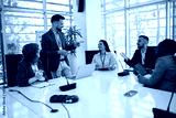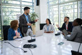 Man CEO talking on microphone on a meeting with his colleagues about business plan, future collaboration.