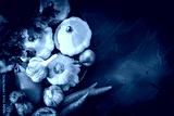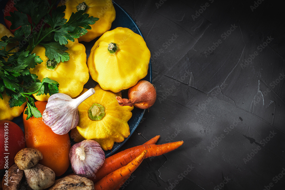 Autumn and summer vegetables and mushrooms on a black background. Small yellow pumpkins, carrots, tomatoes and cucumbers, garlic, onions. Seasonal vegetables, harvest. Copyspace, space for text